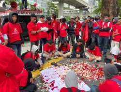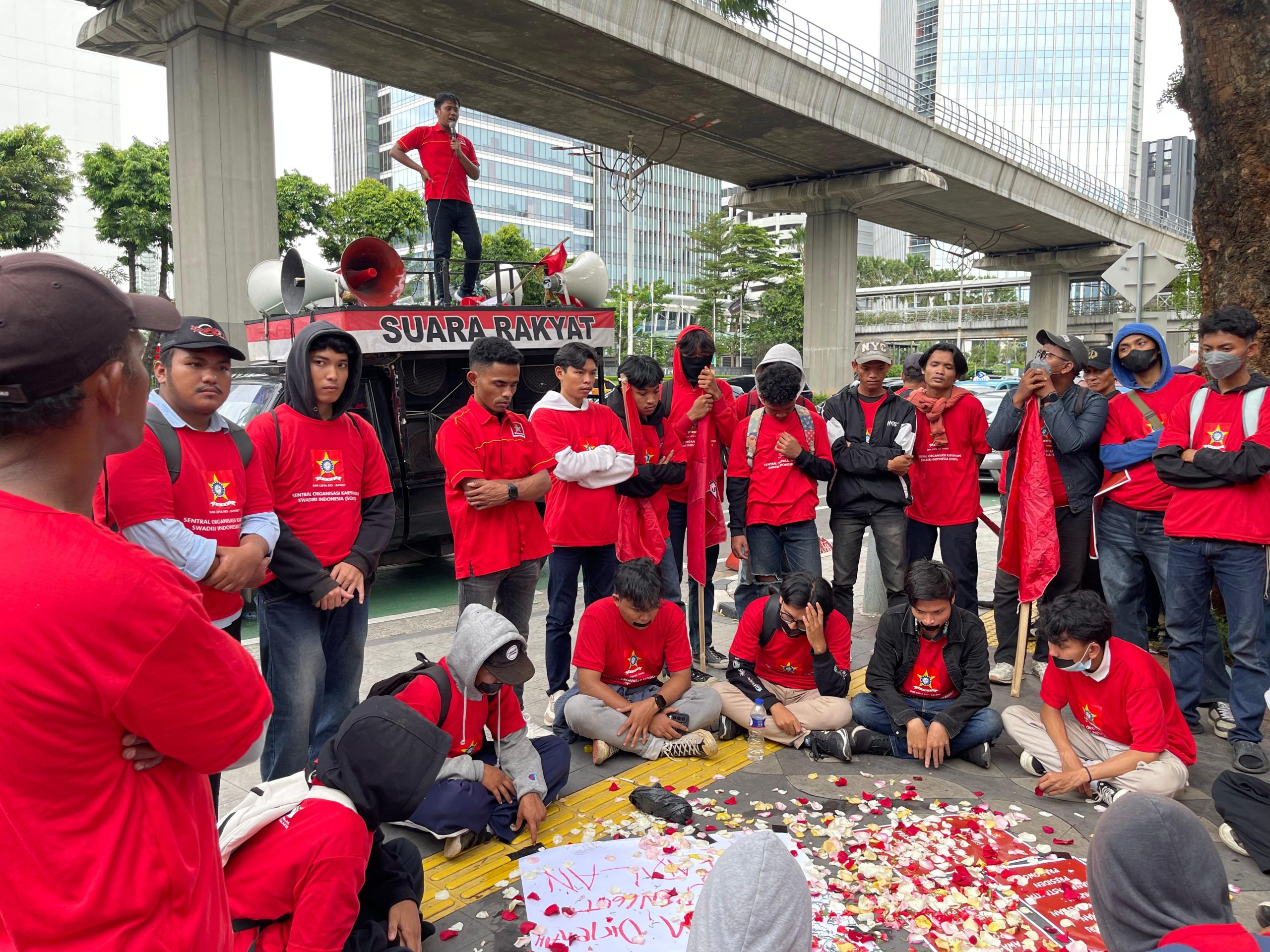 Aksi tersebut diakhiri dengan Teatrikal dimana masa aksi menutup mulut mereka dengan lakban duduk di depan tulisan dimana hukum di Indonesia bisa dibeli pejabat yang punya kepentingan, sementara beberapa masa aksi lainnya menaburkan bunga tabur dan air mawar menyatakan Hukum di Indonesia sudah Mati.(JNAS).
