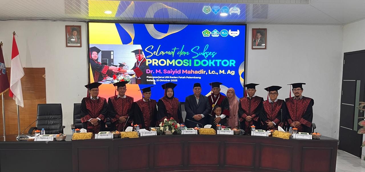 Jelajahnusantara.co.id| Palembang — Program Pascasarjana Peradaban Islam S3 Universitas Islam Negeri (UIN) Raden Fatah kembali melahirkan seorang doktor baru. Kali ini, M. Saiyid Mahadhir, pendiri Ngajee, berhasil mempertahankan disertasinya yang berjudul _“Difusi Inovasi Ngaji Lagu pada Masyarakat Ogan Ilir Sumatera Selatan”_ dalam sidang terbuka promosi doktor, Selasa, 31 Oktober 2025.