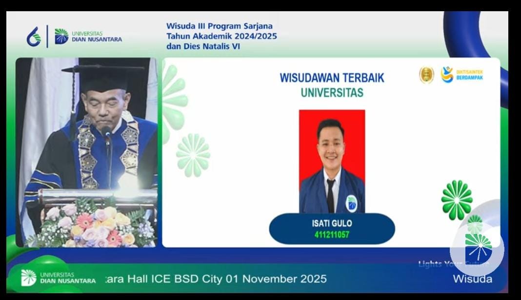Dalam kesempatan tersebut, Universitas Dian Nusantara juga memberikan penghargaan kepada lulusan Wisudawan terbaik yaitu Isati Gulo, sebagai bentuk apresiasi atas prestasi akademik dan nonakademiknya.