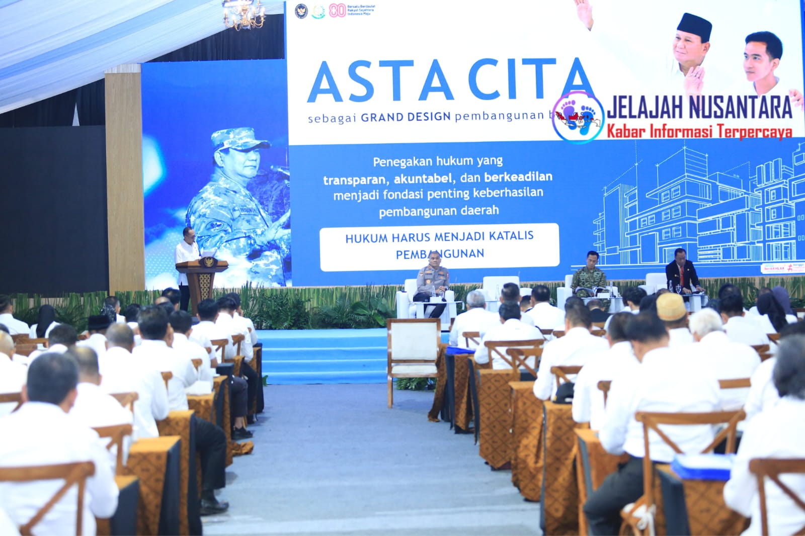 Dalam paparannya, Teguh Subroto menekankan bahwa penegakan hukum harus mampu mendukung keberhasilan pembangunan melalui pendekatan yang tidak semata-mata berorientasi pada penindakan. “Hukum harus menjadi katalis pembangunan,” tegasnya.