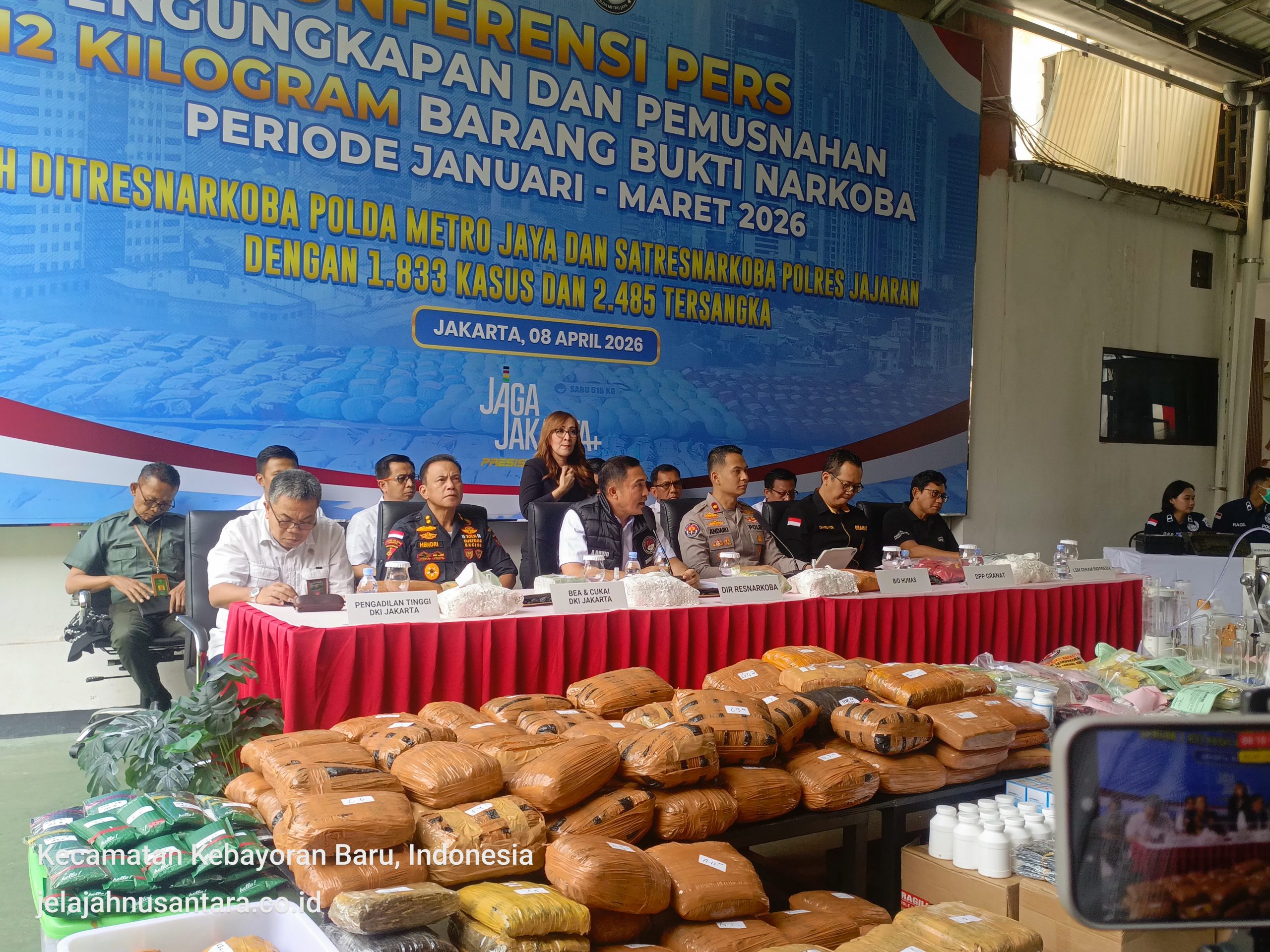 Jelajahnusantara.co.id| Jakarta, 8 April 2026 – Polda Metro Jaya melalui Direktorat Reserse Narkoba bersama Satresnarkoba Polres jajaran berhasil mengungkap berbagai kasus tindak pidana narkotika selama periode Januari sampai dengan Maret 2026, sekaligus melaksanakan pemusnahan barang bukti narkoba hasil pengungkapan, dengan rincian sebagai berikut: